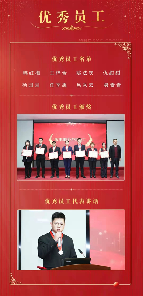 2021年,有一群銀豐人在工作中兢兢業業,在崗位上發光發熱,以實際行動展現出銀豐人的責任與擔當,成為了我們身邊的榜樣,彰顯進步,鼓舞斗志。2021年銀豐集團優秀員工表彰大會評選出8位優秀員工,他們中有開拓進取的地產開發經理,有盡職盡責的物業工程主管,有業績不凡的生物地區經理,還有一年收到108封感謝信,40余張認可卡的樓層服務員等。他們一個個感人的事跡,優異的成績,都成為了銀豐人的標桿與榜樣。